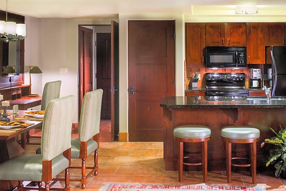 This suite features a living room that opens onto a balcony or patio, a fireplace and a full kitchen. There is also a bathroom with a walk-in shower and a spa bath.